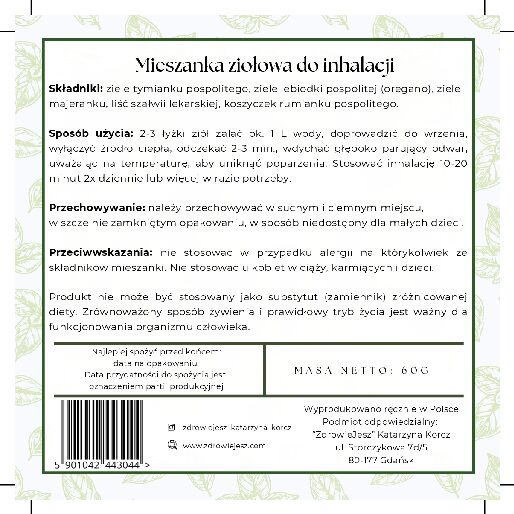 Skład: ziele tymianku pospolitego, ziele lebiodki pospolitej (oregano), ziele majeranku, liść szałwii lekarskiej, koszyczek rumianku, pąki sosny.